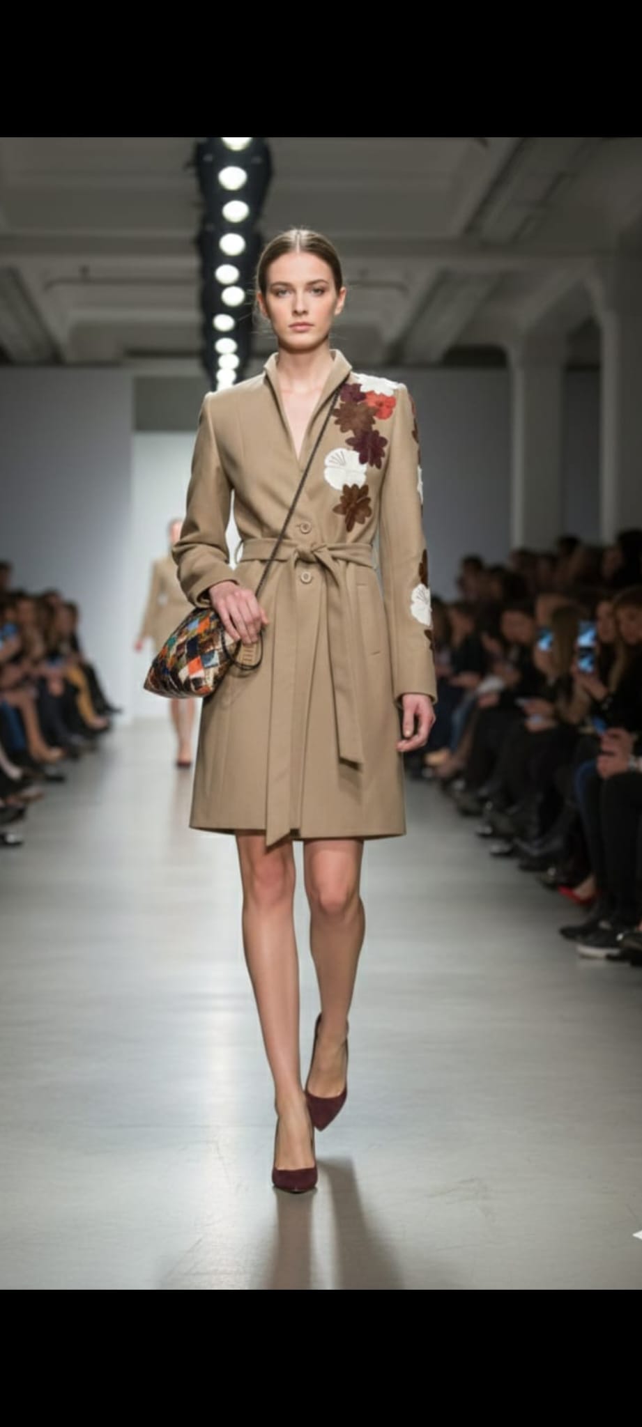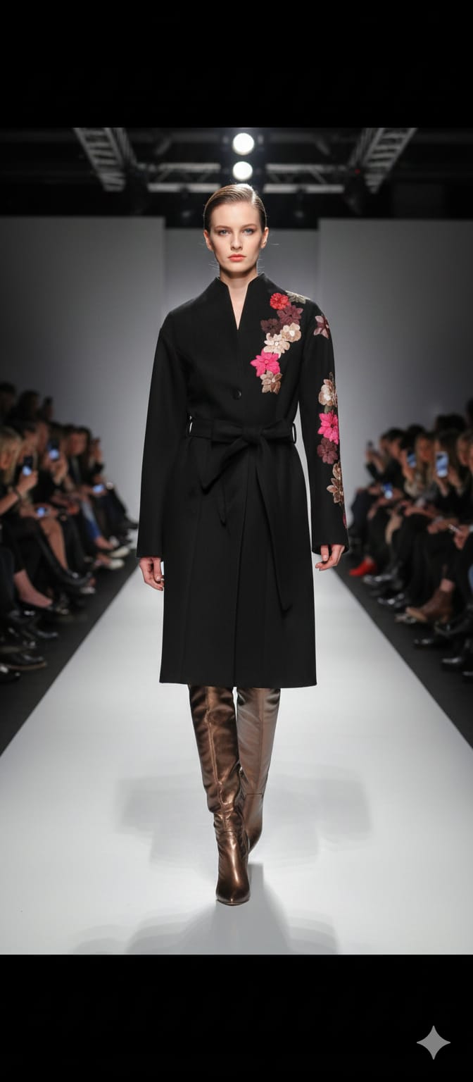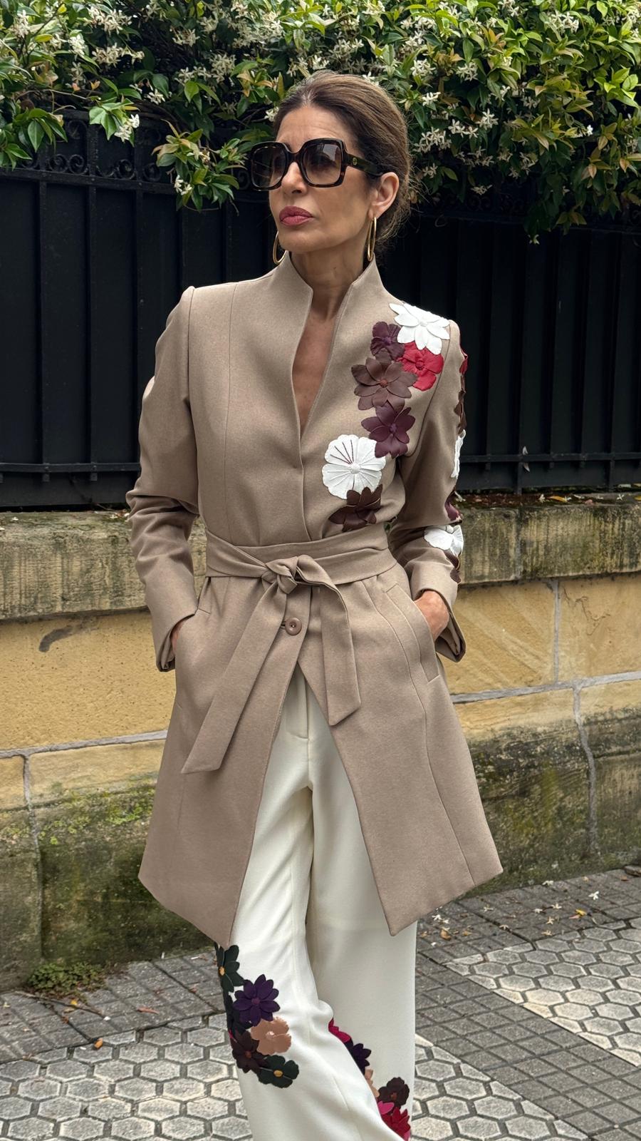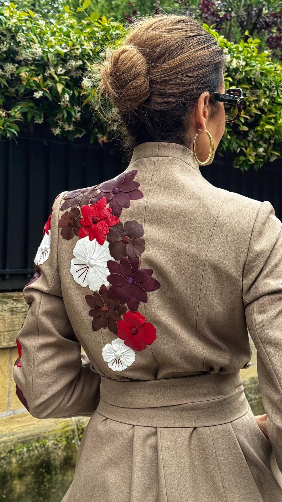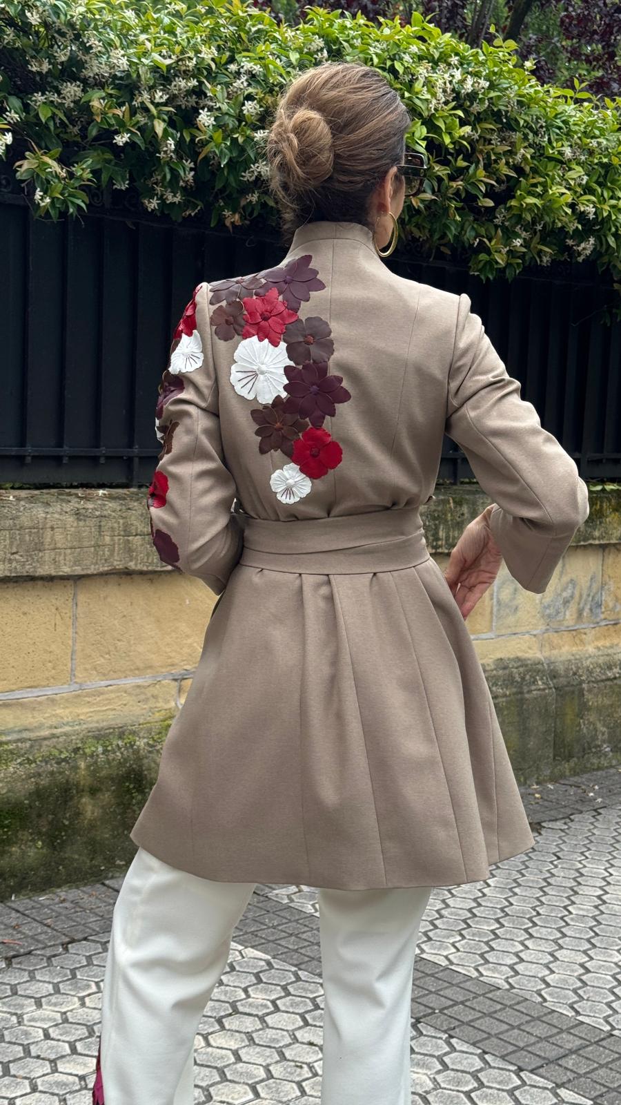 El Abrigo Flores es una obra de arte en la moda, con flores elaboradas gamuza, cuero y pomadora, con finos detalles de hilo bordados a mano en algunos pétalos de las flores.