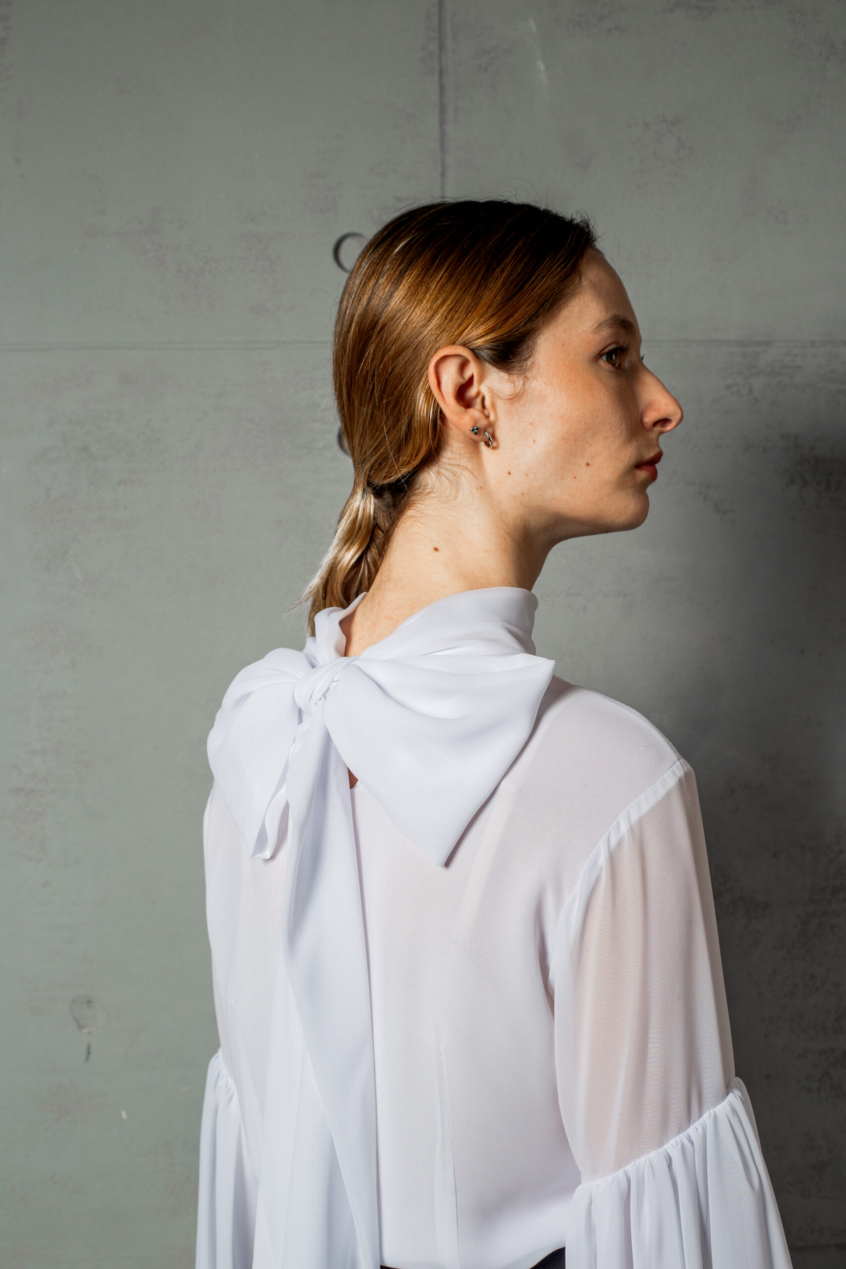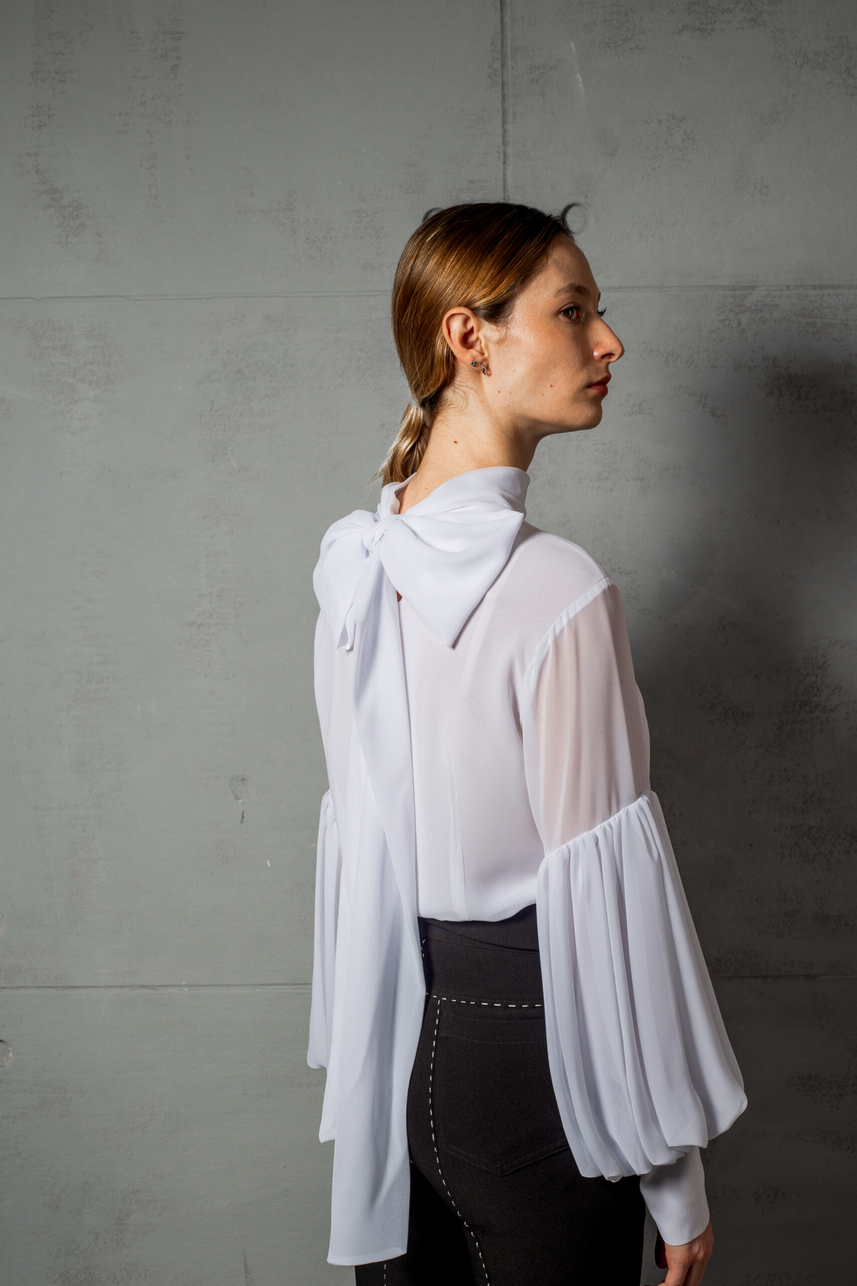 Confeccionada en seda ligera, esta blusa se distingue por su silueta limpia y su sofisticada construcción. El diseño incorpora largos lazos en el cuello que permiten llevar el moño tanto al frente como en la espalda, adaptándose con elegancia a diferentes estilos y ocasiones. Las mangas amplias, cuidadosamente fruncidas, aportan volumen y movimiento, equilibrando la ligereza del tejido con una presencia sutilmente dramática. Una prenda versátil y refinada, ideal para quienes buscan elegancia contemporánea con detalles distintivos.