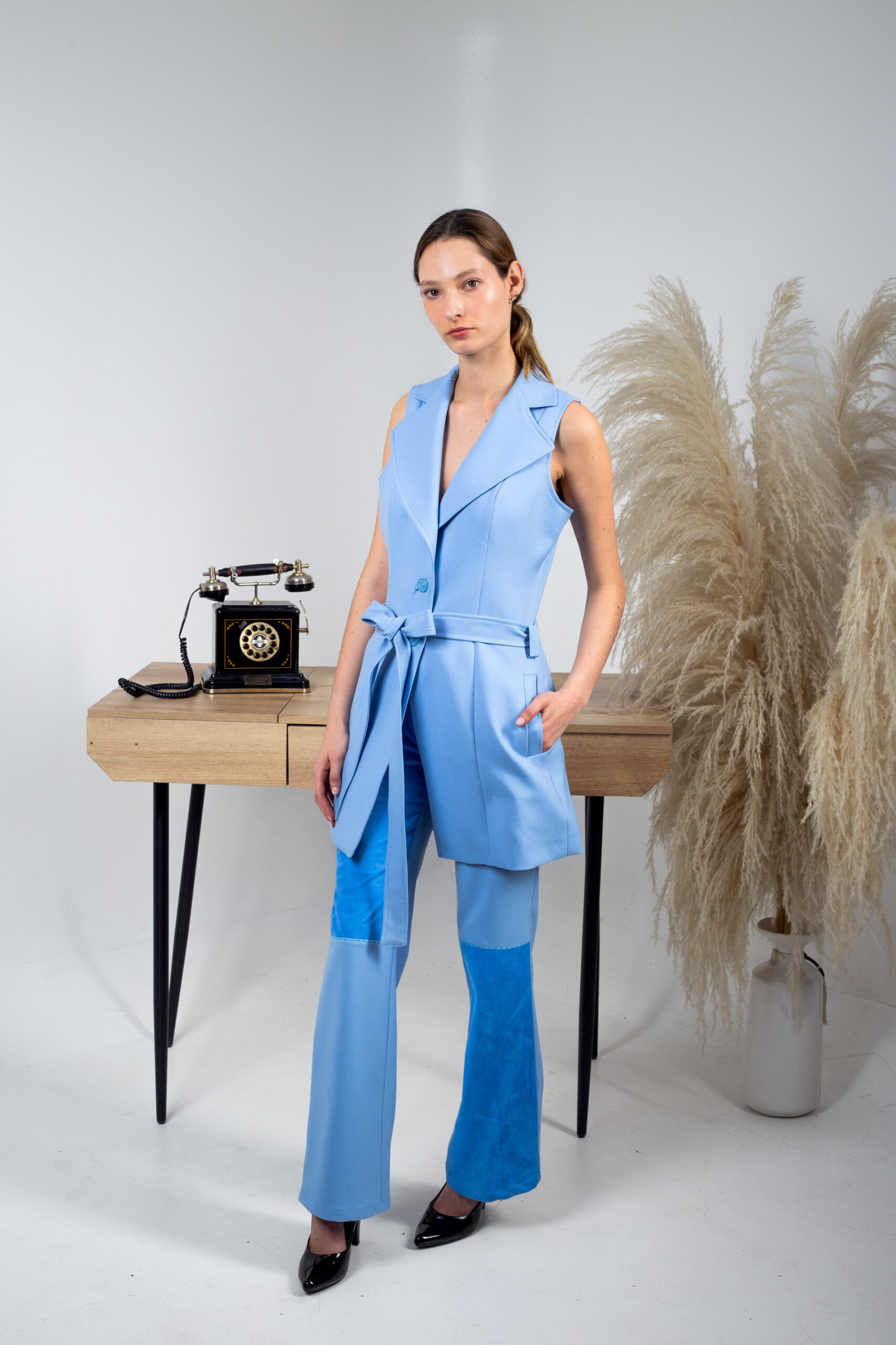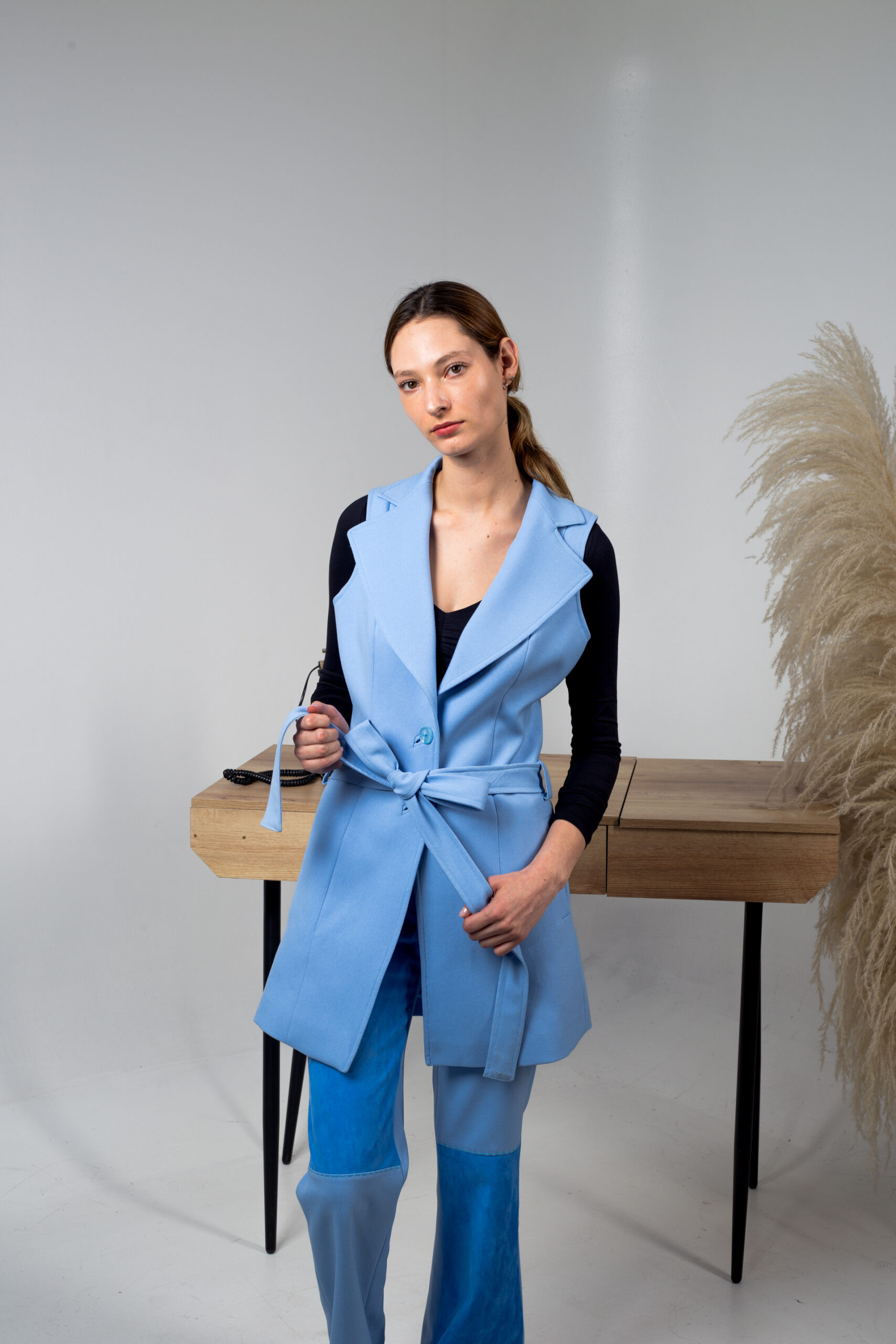 El Chaleco Lirio redefine la sobriedad con un diseño limpio y femenino. Confeccionado en moet, su estructura larga aporta fluidez y presencia, mientras que el cinturón del mismo material permite ajustar la silueta con sutileza. Su diseño sin mangas y cuello sastre lo convierte en una prenda versátil, ideal para superponer y elevar cualquier look con un gesto de elegancia contemporánea.