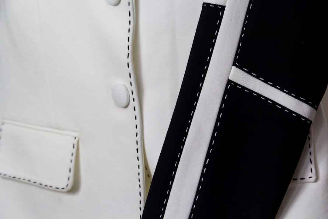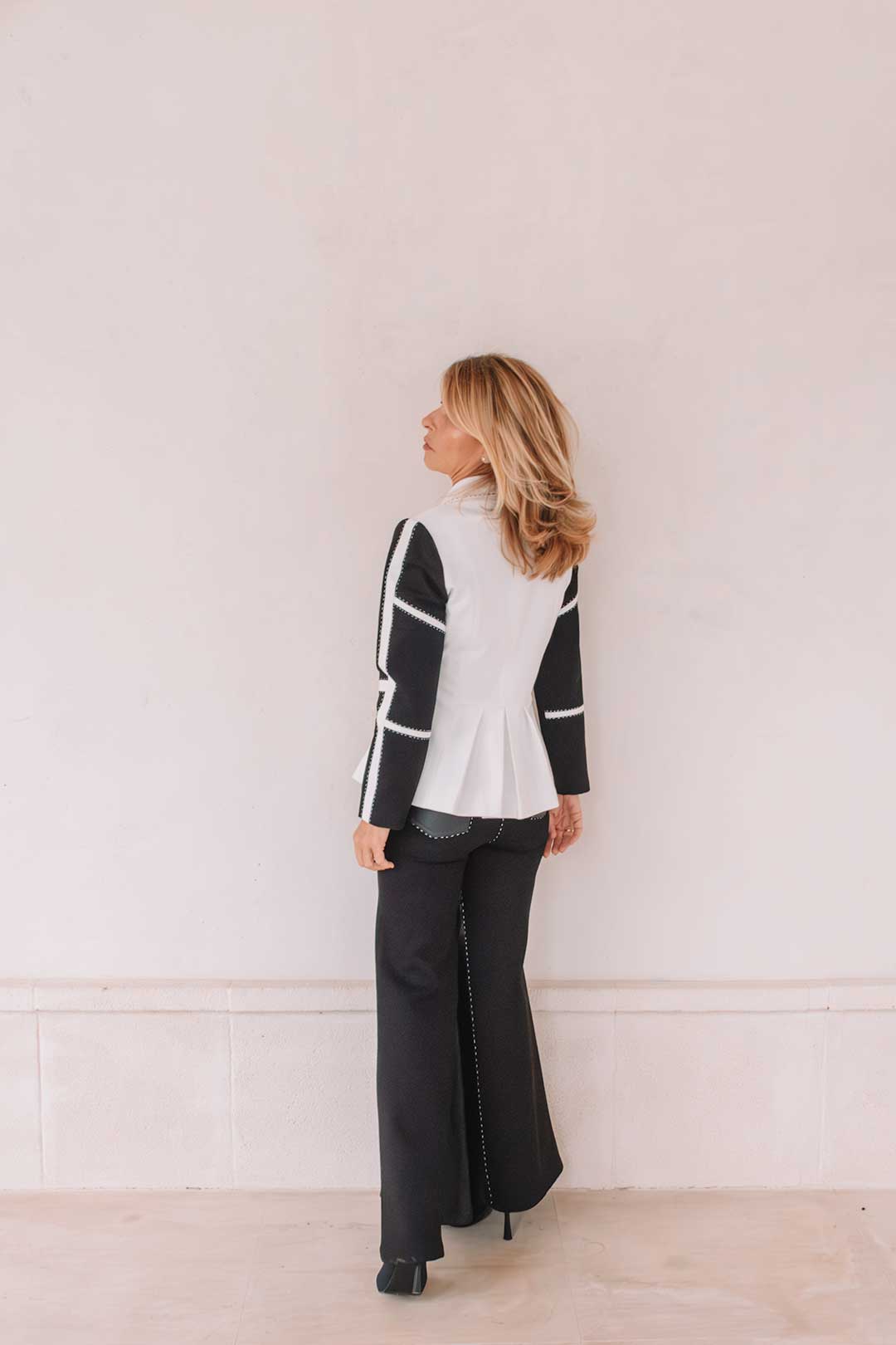 La Chaqueta Sakura Combinada es un reflejo de la creatividad y la exclusividad, mezclando pomadora en blanco y negro. Su estructura resalta el diseño hecho a mano, destacando mangas y pespuntes con un acabado impecable.
