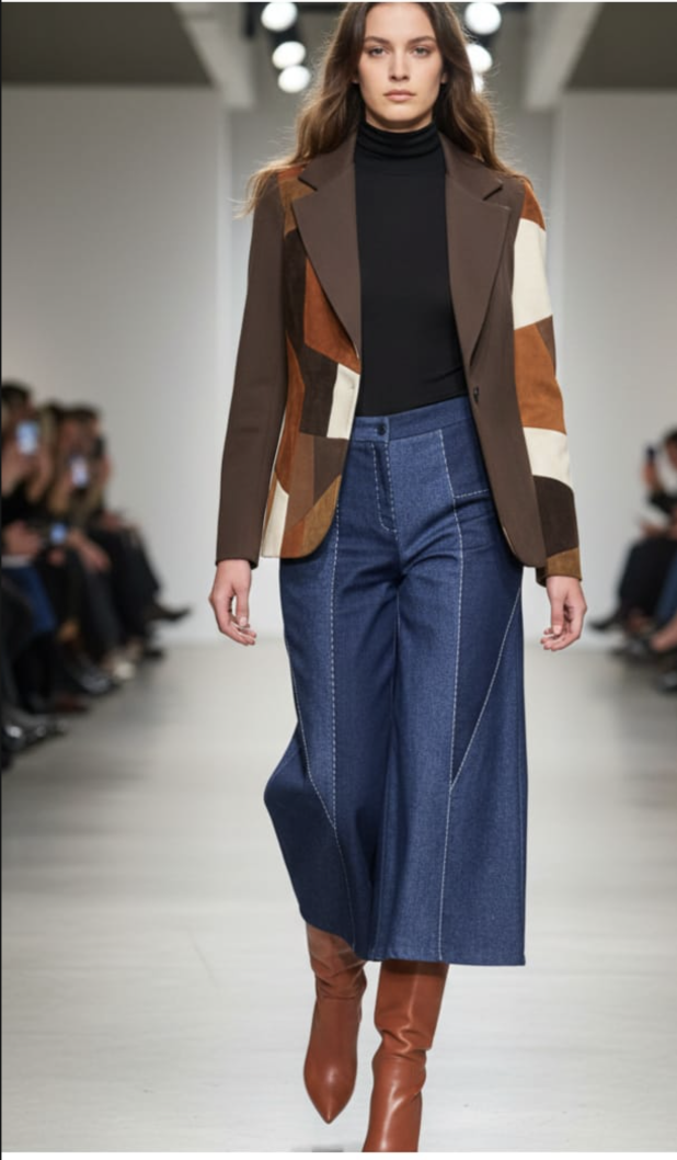 La Chaqueta Vital encarna una elegancia contemporánea con sello artístico. Su estructura impecable en pomadora otorga una silueta definida y refinada, mientras que los retazos en cuero y gamuza —dispuestos en un mosaico de tonos azules, negros y arena— aportan textura, contraste y profundidad visual.