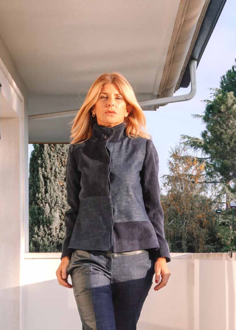Elaborada en denim, la Chaqueta Hortencia cuenta con una abotonadura escondida y elegante mangas combinadas en denim y pana, logrando una combinación de texturas que la convierten en una prenda sofisticada y versátil.