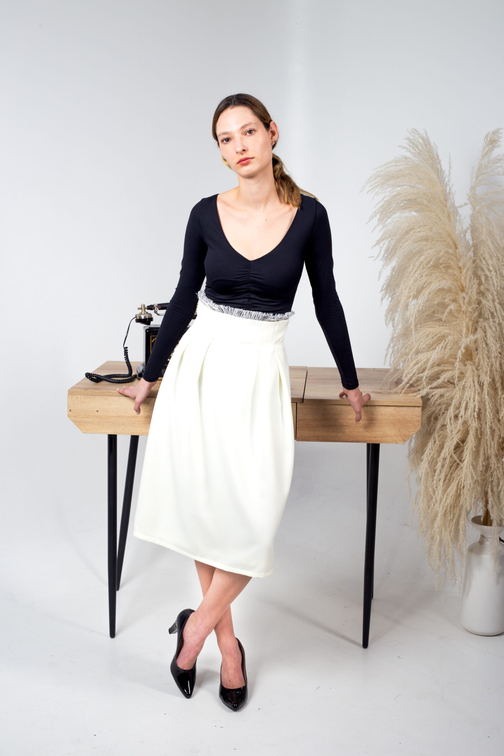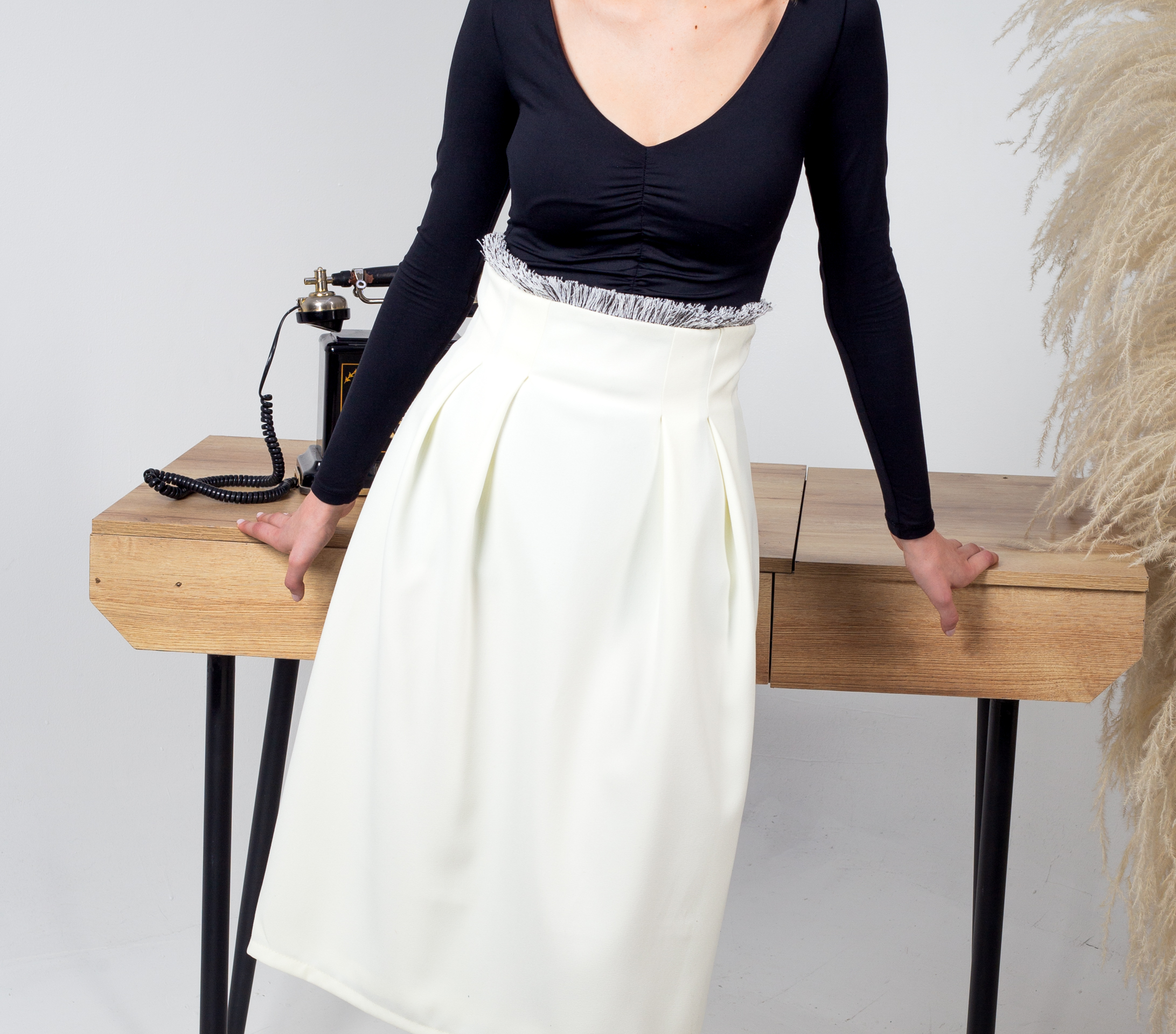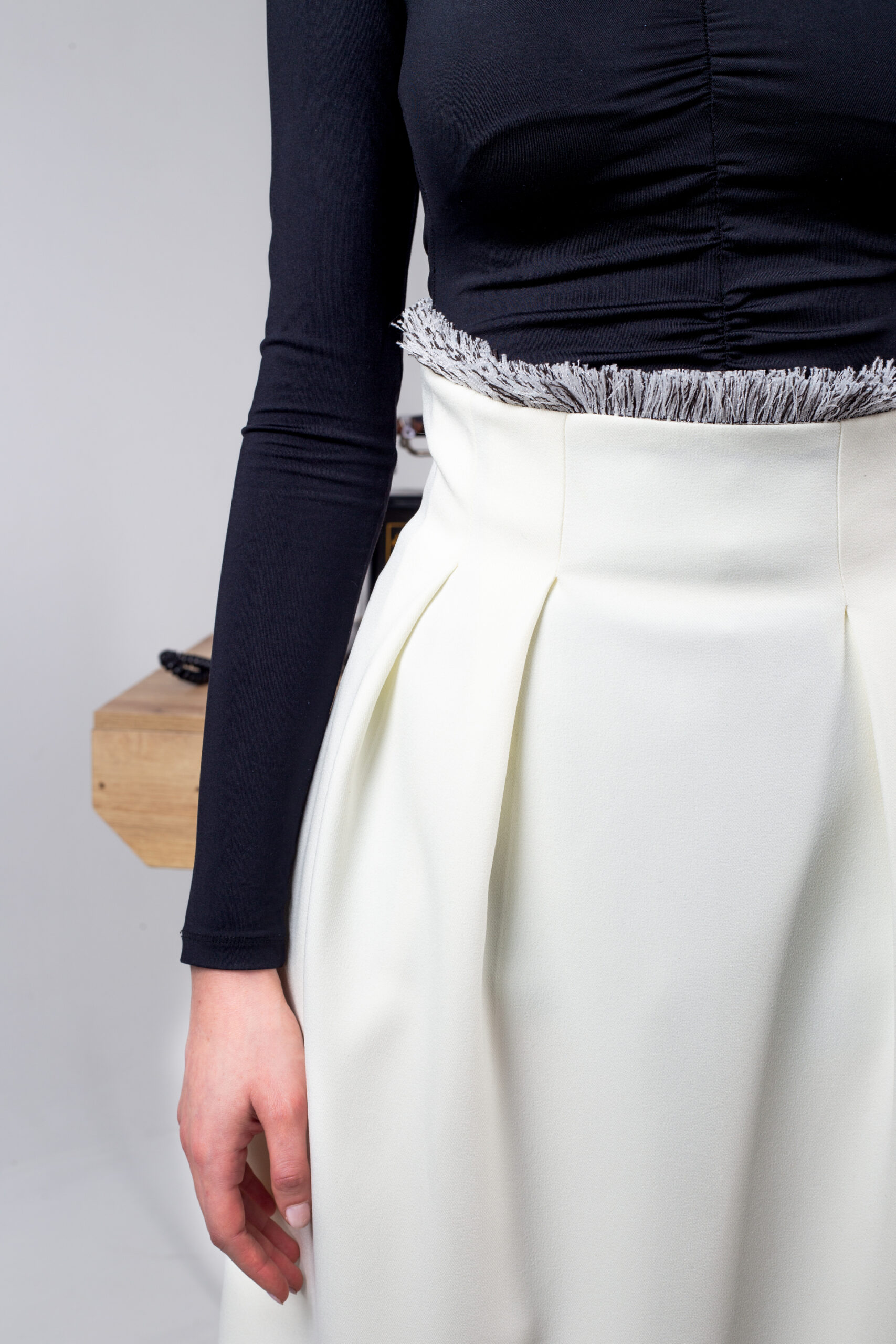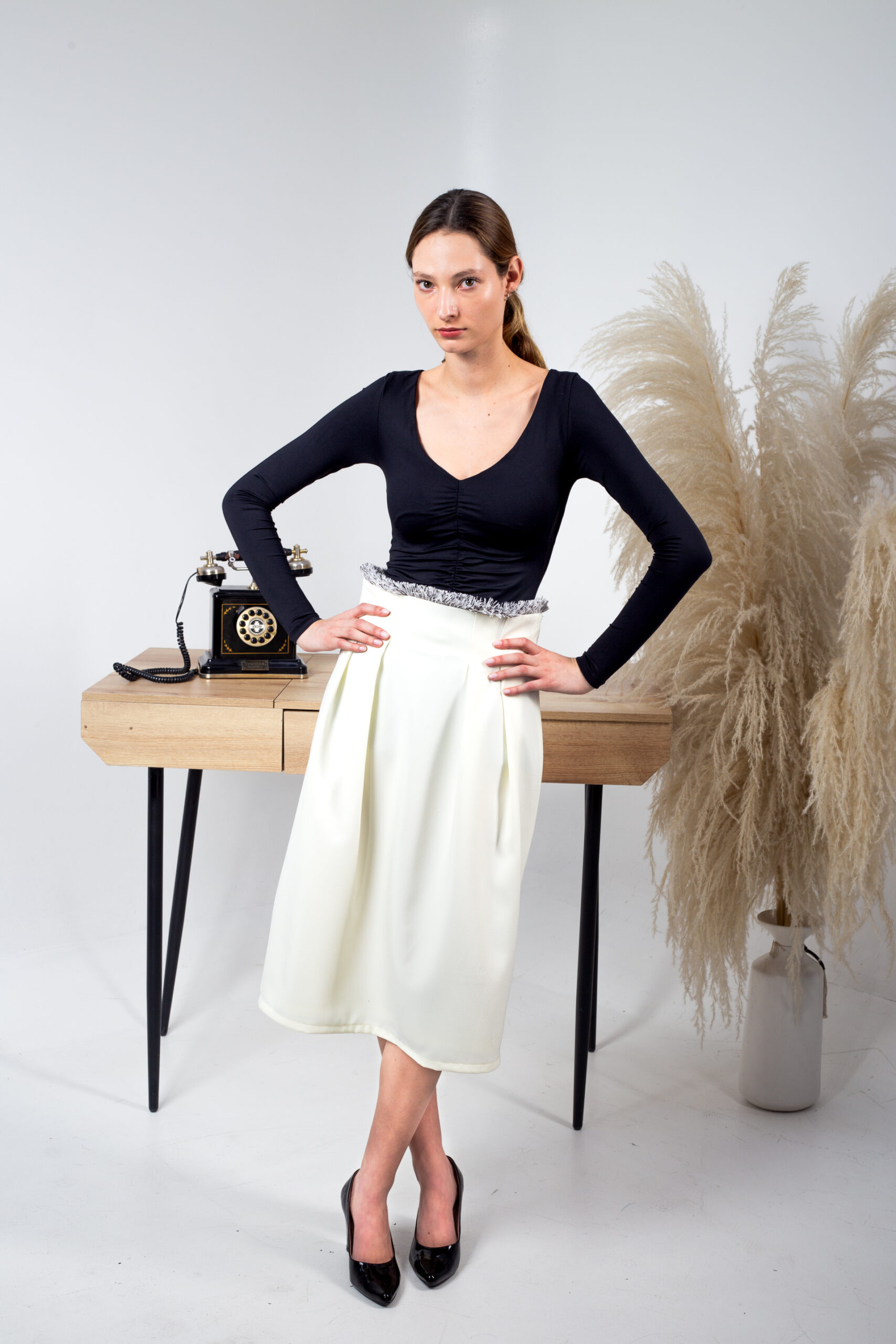 La Falda Bruma combina simplicidad y detalle con un diseño que resalta por su delicadeza. Su base lisa permite que la silueta fluya con naturalidad, mientras que los sutiles flecos al final de la pretina aportan un giro textural inesperado. Esta prenda equilibra elegancia clásica con un toque artesanal, ideal para quienes aprecian los acabados distintivos en piezas atemporales.
