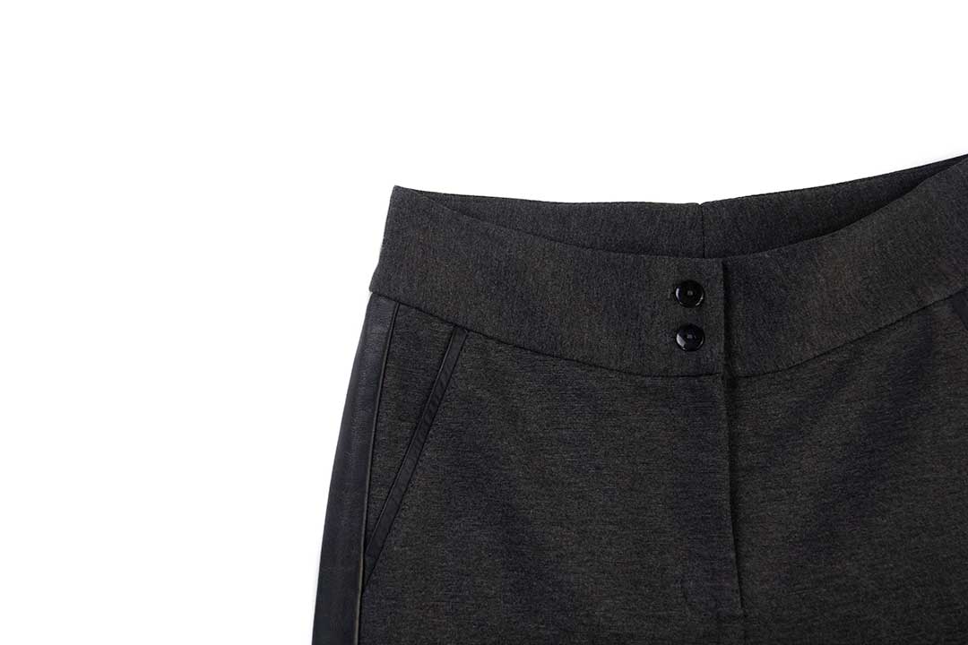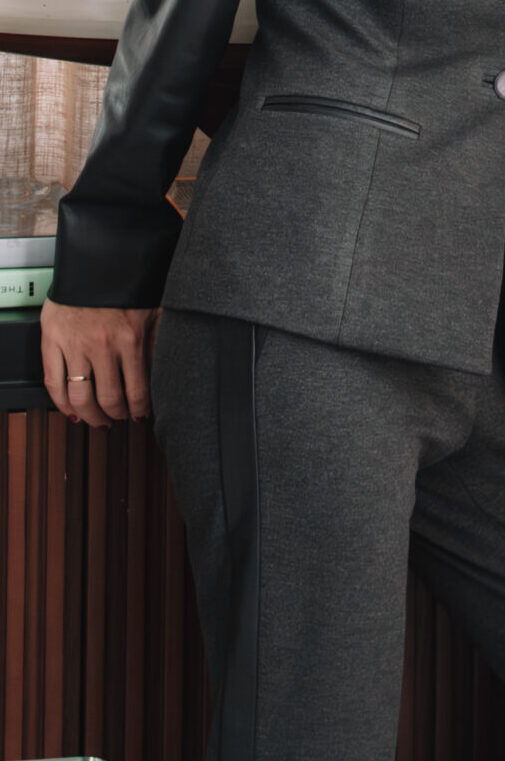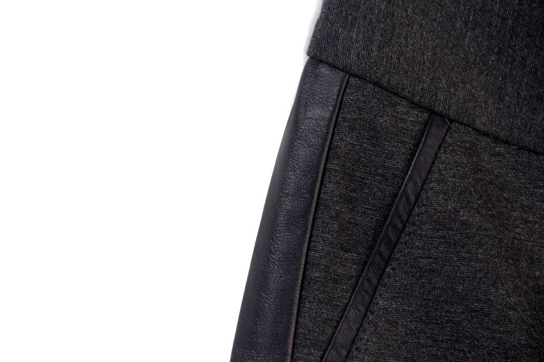 Su estructura de acabado suave se ve realzada por tiras laterales de cuero, que recorren la prenda con un efecto dinámico y estilizado.