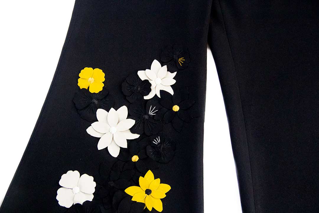 El Pantalón Flores es una obra maestra de la moda. Confeccionado en moet y flores a mano en cuero, pomadora y gamuza, este pantalón ofrece un diseño exquisito y sofisticado. Perfecto para ocasiones especiales.