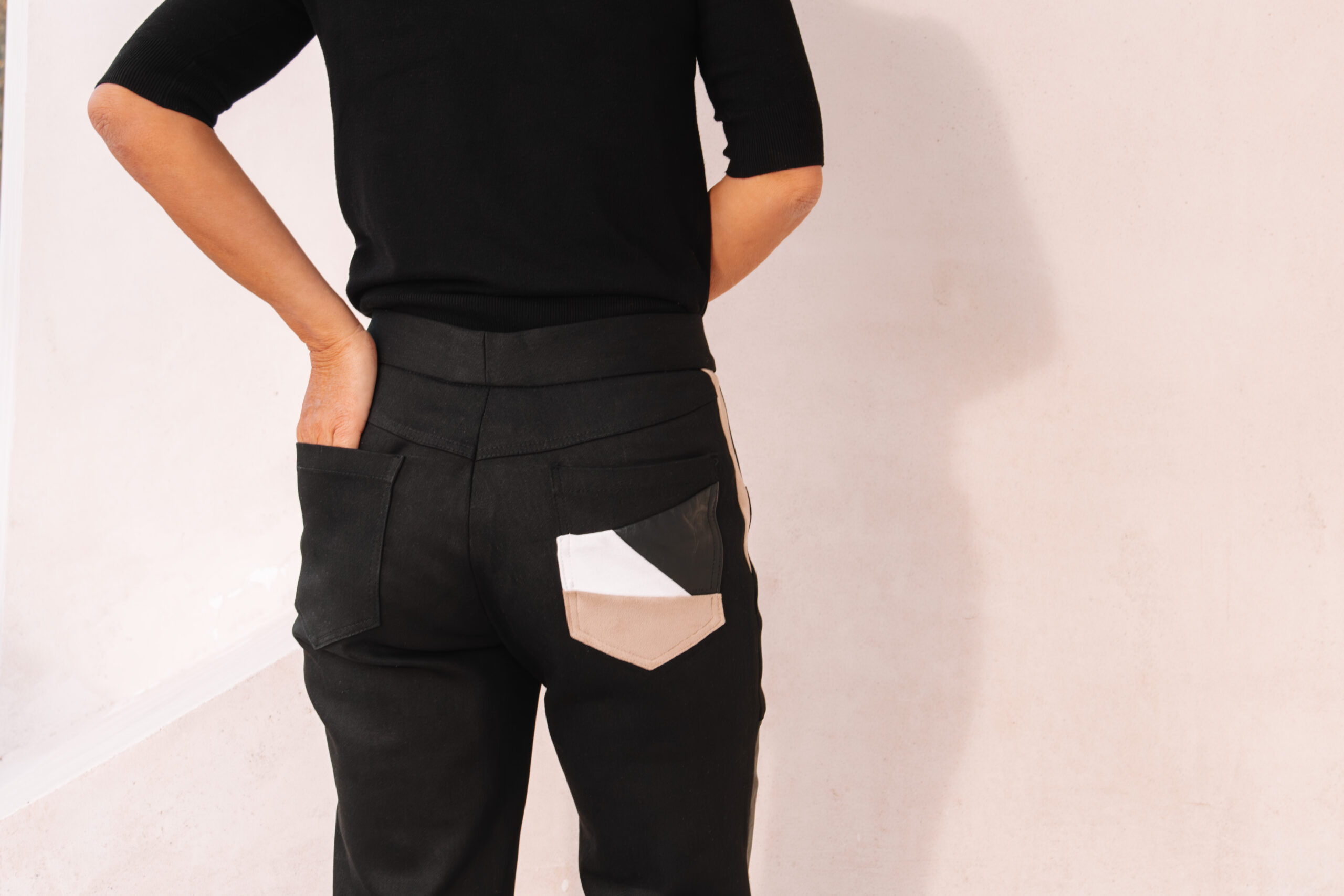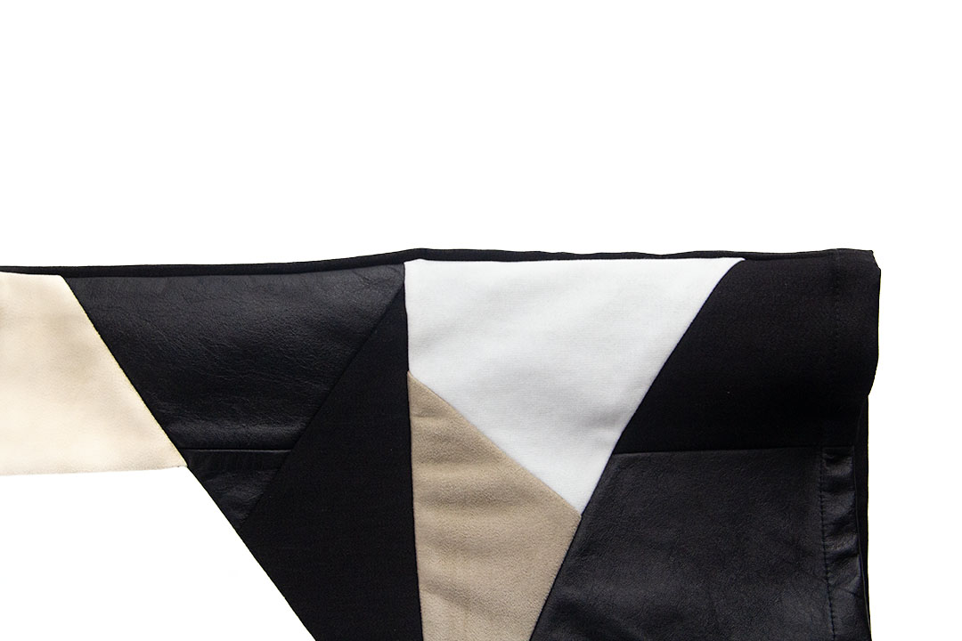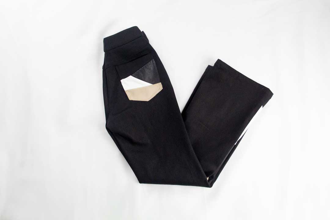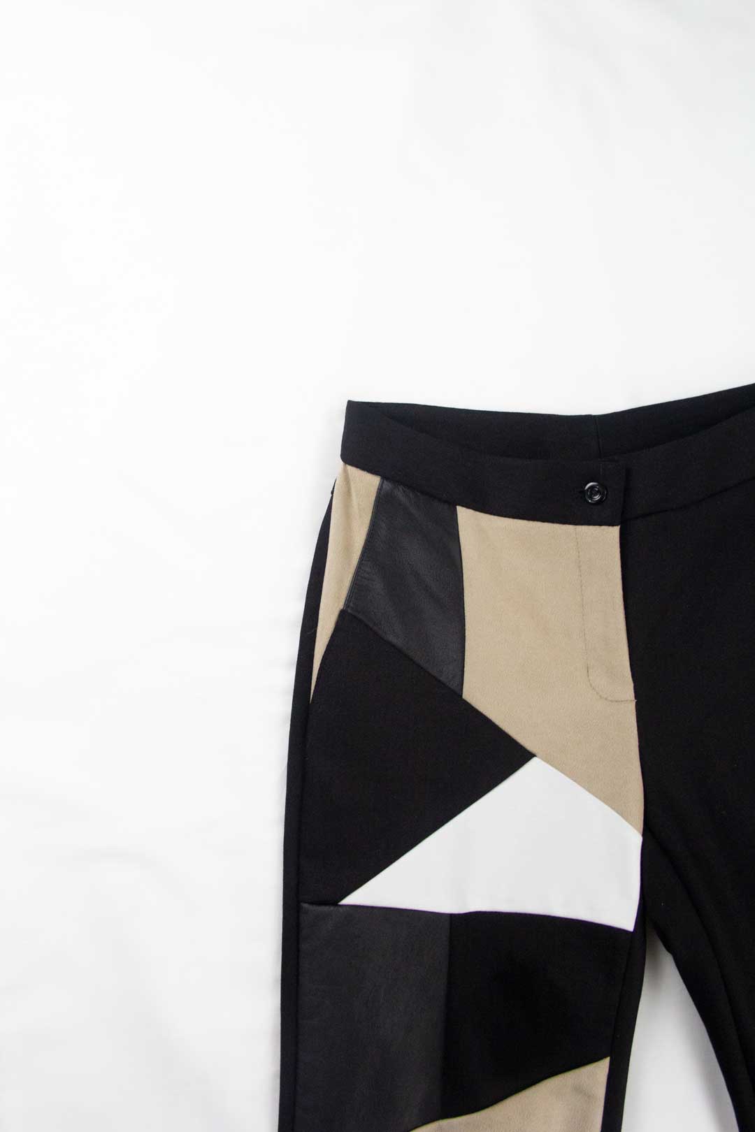 El Pantalón Quetzal 2 es una creación única con combinación retazos de cuero, pomadora y gamuza. Esta mezcla de texturas y materiales crea un look atrevido y elegante.