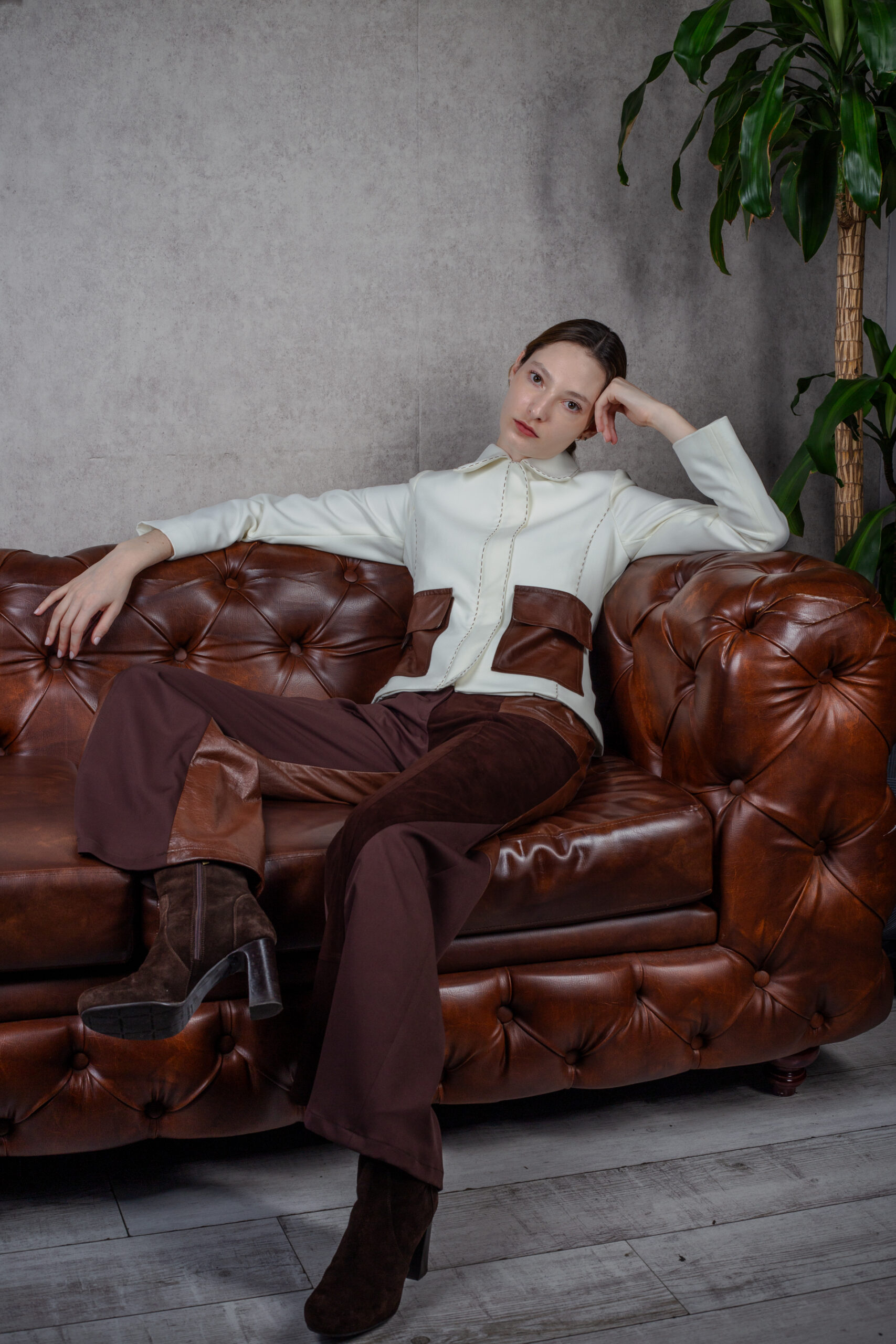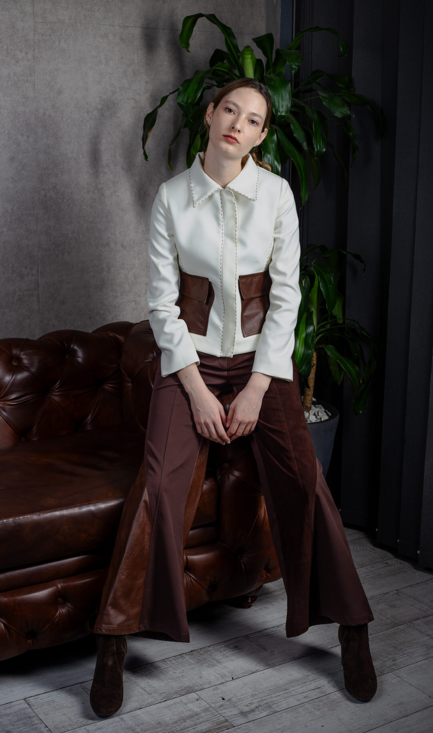 El Pantalón Triángulo Ancho es una declaración de diseño y carácter. Confeccionado en una armoniosa combinación de gamuza, tela y cuero en tres tonos tierra, esta pieza celebra la riqueza de las texturas y los contrastes. Su silueta amplia y estructurada aporta movimiento y presencia, convirtiéndolo en una prenda ideal para quienes buscan destacar con sofisticación y originalidad.